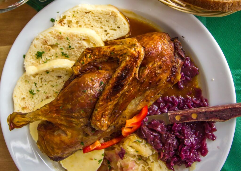 - Pečená kachna se zelím a knedlíky: Roasted duck with cabbage (usually braised red cabbage) and dumplings. A hearty, celebratory dish.