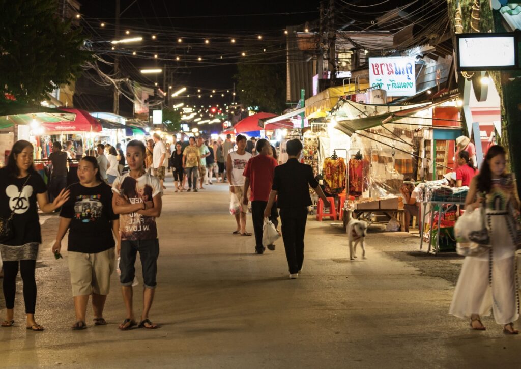 After dinner, walk the street. Try moo ping (grilled pork skewers, 10 baht each). Get mango sticky rice if it’s mango season—60-80 baht for a portion that could feed two people. Try khanom buang (crispy Thai crepes filled with coconut cream, 30 baht). Grab a bag of fresh-cut fruit—30-50 baht.