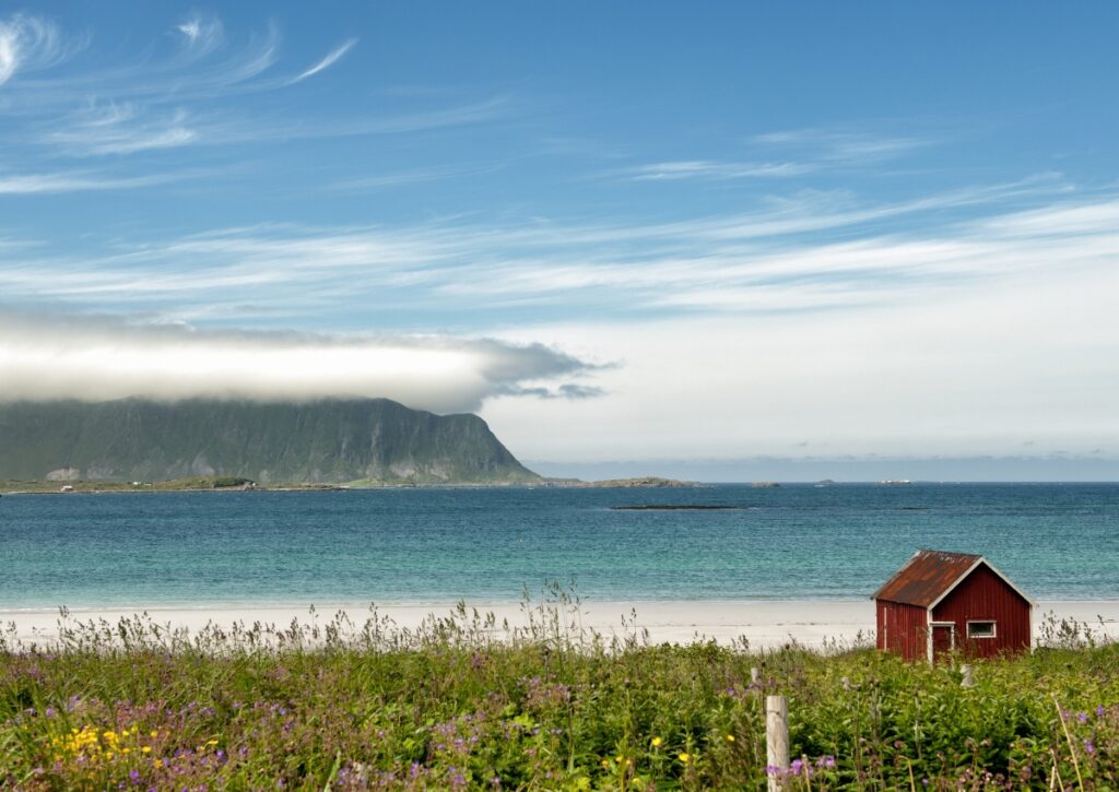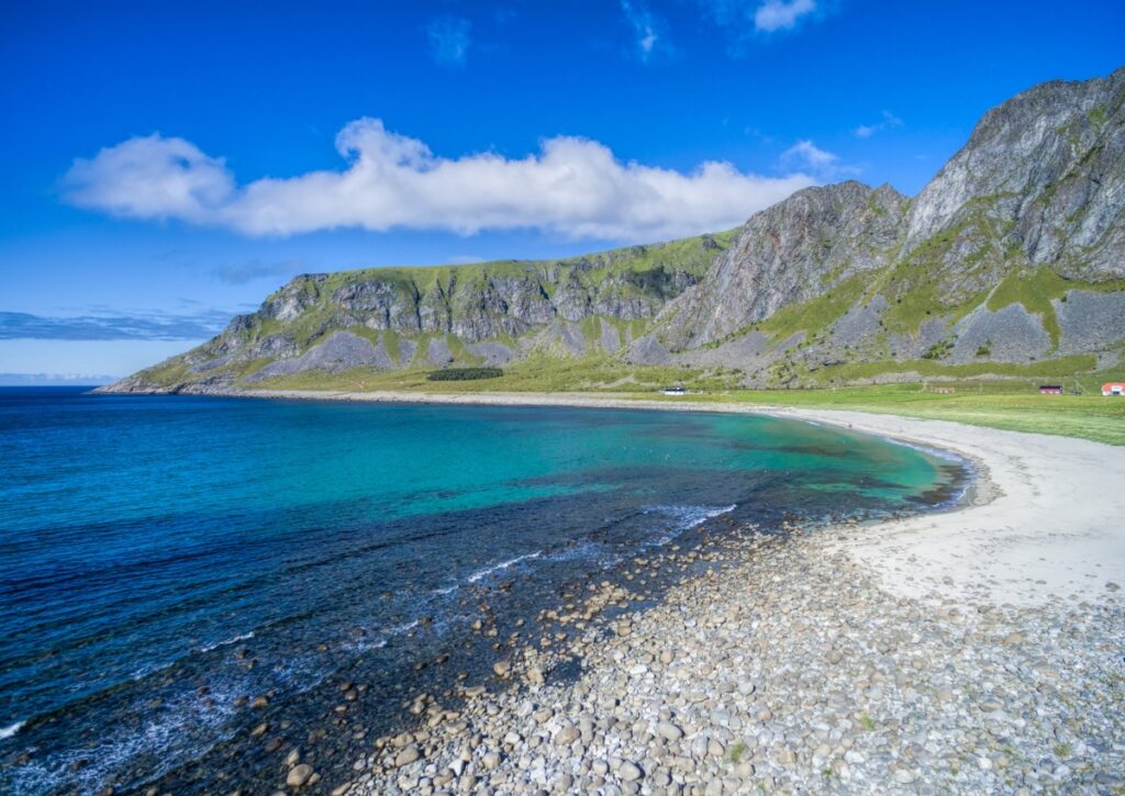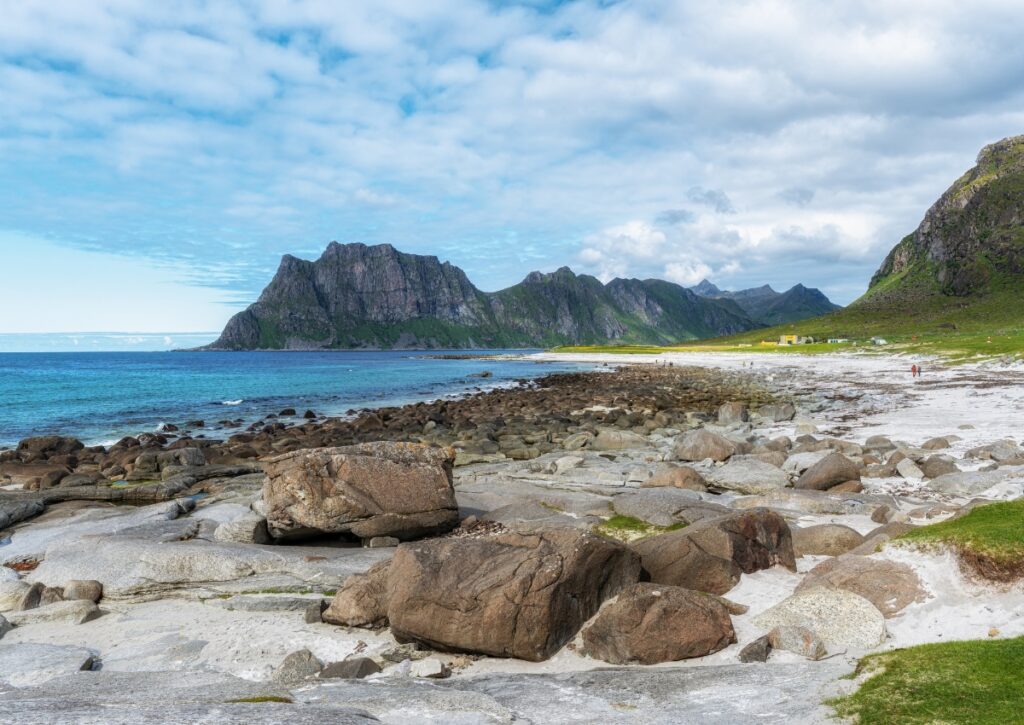 Haukland is probably the most popular beach, easily accessible right off the E10. There’s parking, bathrooms, and in summer, food trucks. The beach is a long curve of white sand with views of the surrounding peaks and usually some surfers in wetsuits catching waves.