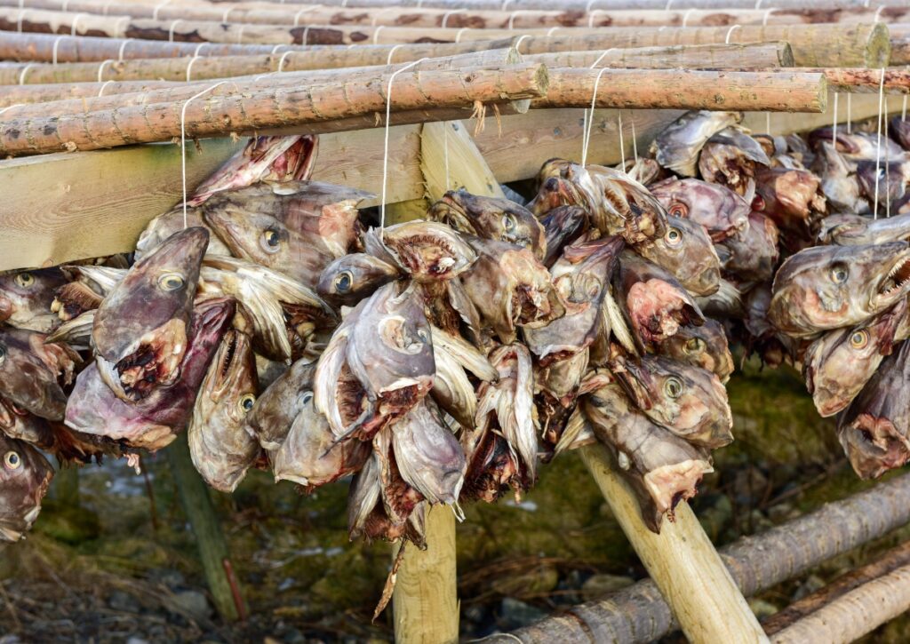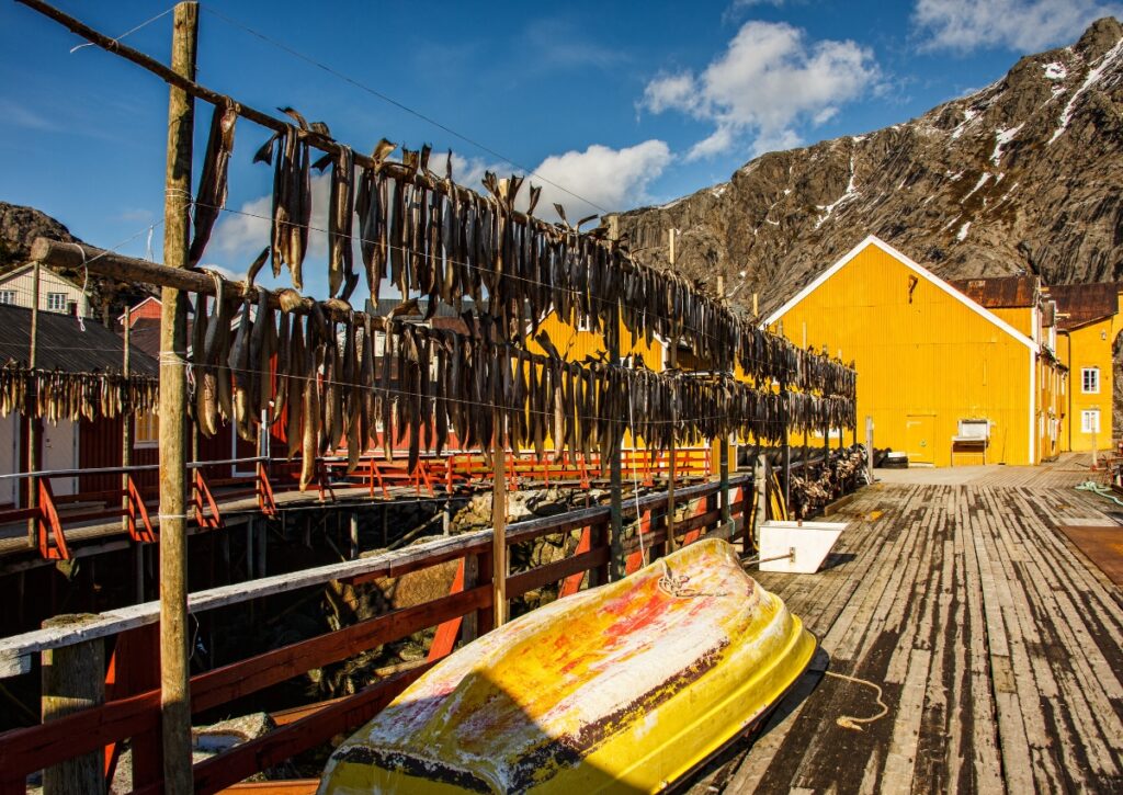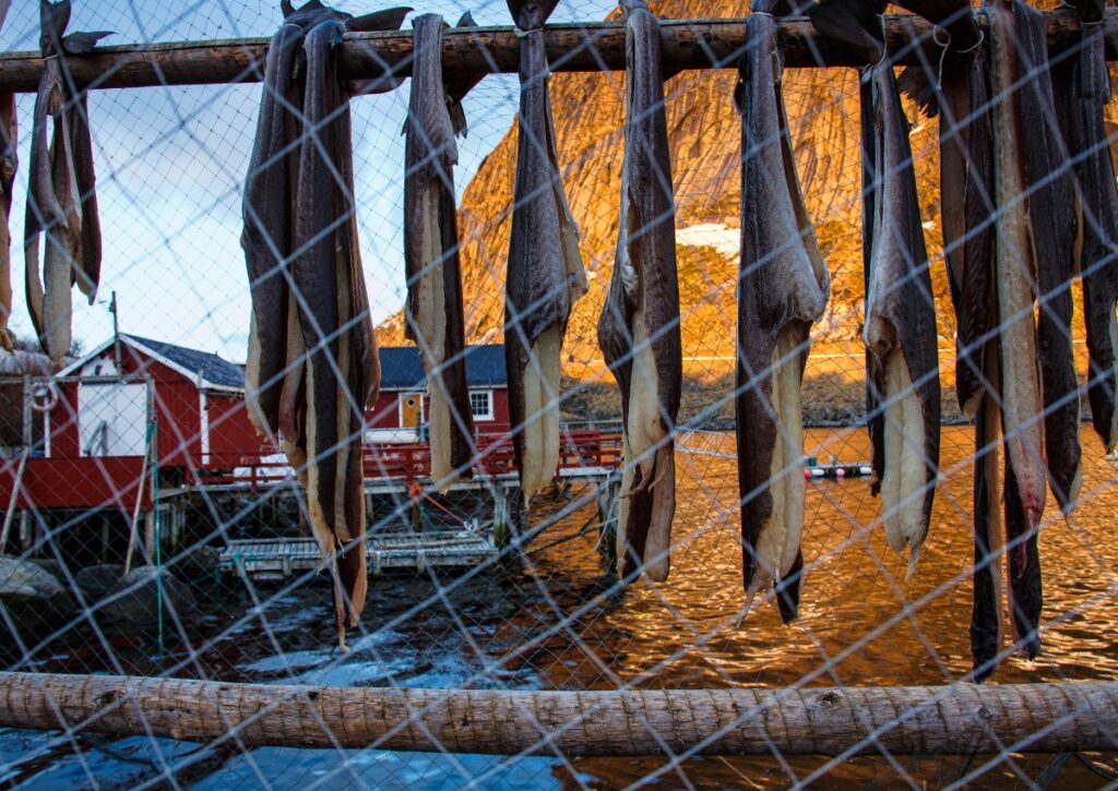 You’ll see dried cod (tørrfisk or stockfish) everywhere in Lofoten. It’s been the economic foundation here for centuries—cod caught in winter, dried on wooden racks, exported all over the world. The racks are everywhere, and in winter/spring, the fish hang like weird curtains flapping in the wind.